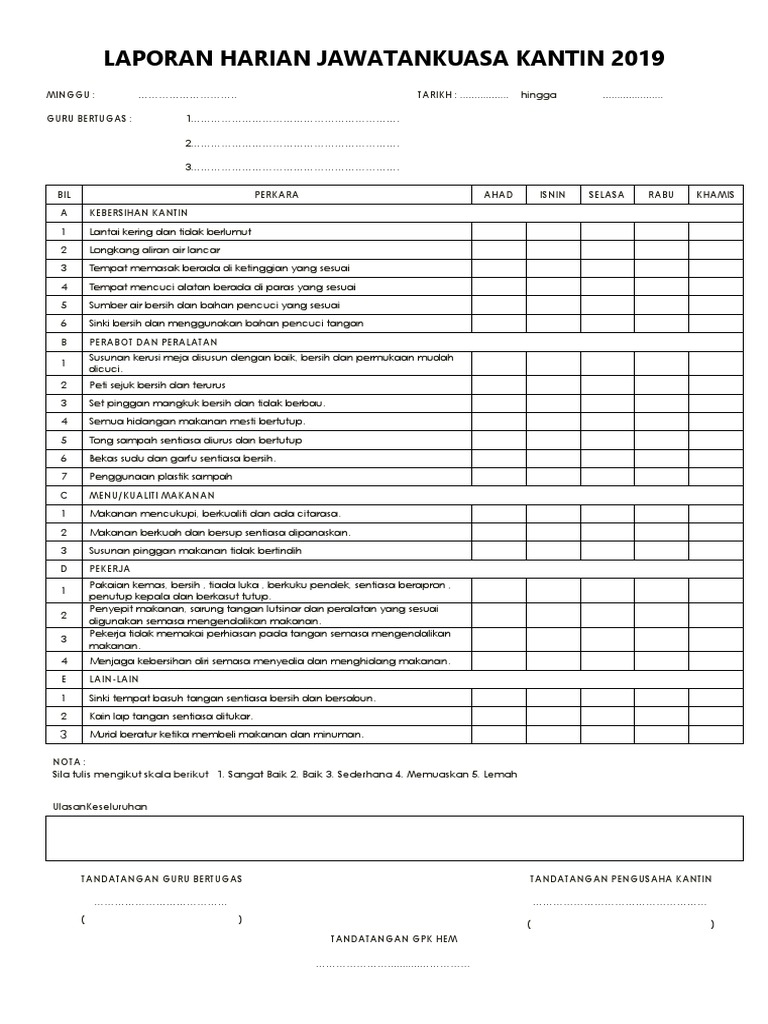 Up to 24 cash back LAPORAN HARIAN PEMERIKSAAN KENDIRI KANTIN DAPUR ASRAMA BIL Status Markah Demerit ULASAN TINDAKAN Pengendali Makanan. Lakukan riset terlebih dahulu. Minit Kantin Bil 1 2017.